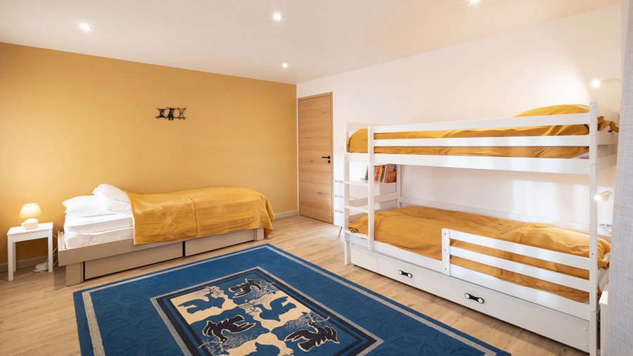 1 chambre avec 4 lits simples (2 lits superposés 90×200 et 1 lit modulable 80 / 160×200)